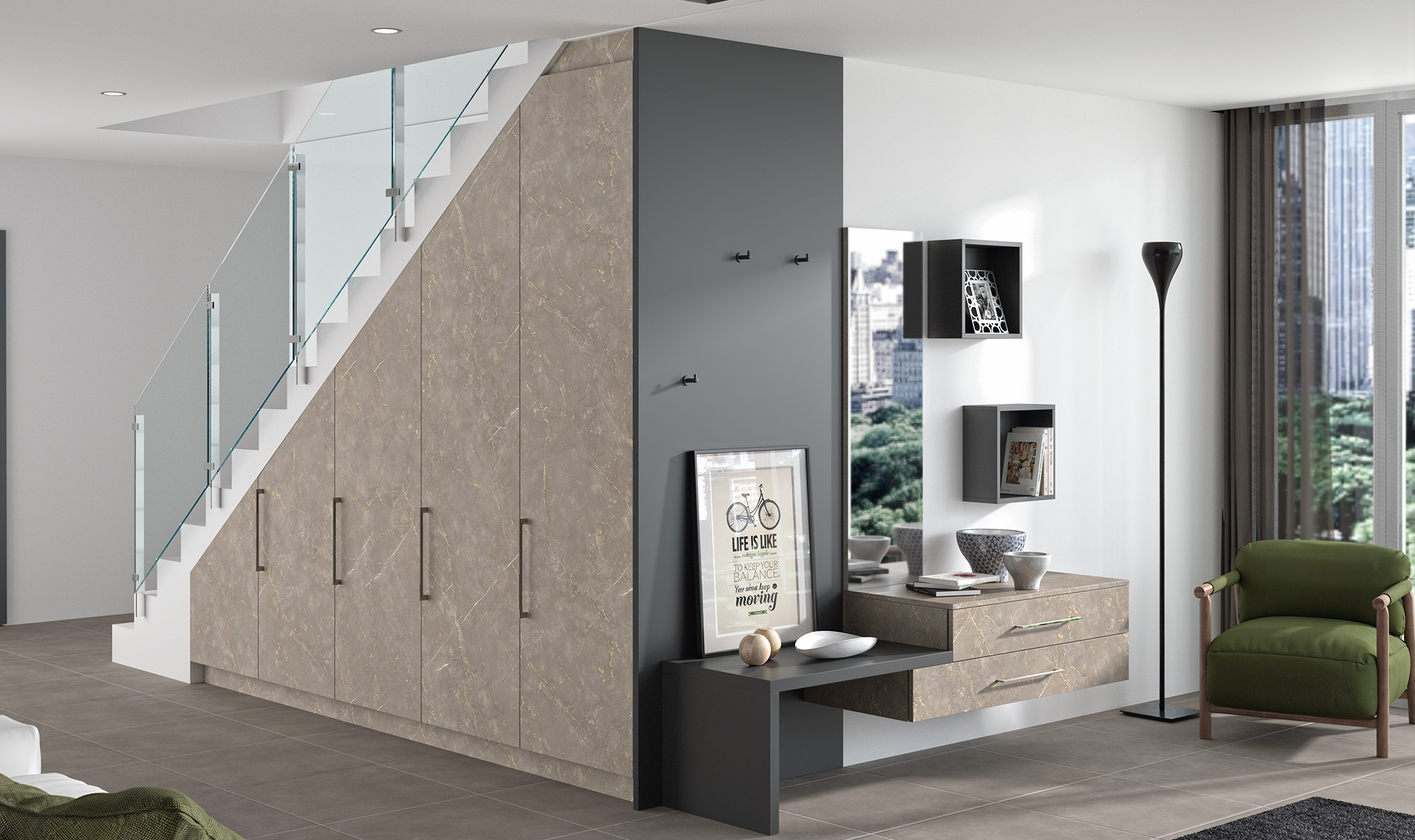 Sonderanfertigungen wie Treppenverbauten sind für uns als Möbelhersteller, entstanden aus einem Tischlereibetrieb, selbstverständlich. Die optimale Nutzung des Raumes unter der Stiege ist bei geringeren Platzverhältnissen oft ein großer Vorteil. Hier sehen Sie einen äußerst geräumigen Treppenverbau, der im Eingangsbereich, zusätzlich zur Garderobe, als Stauraum für Jacken, Mäntel, Schuhe etc. verwendet werden kann.
