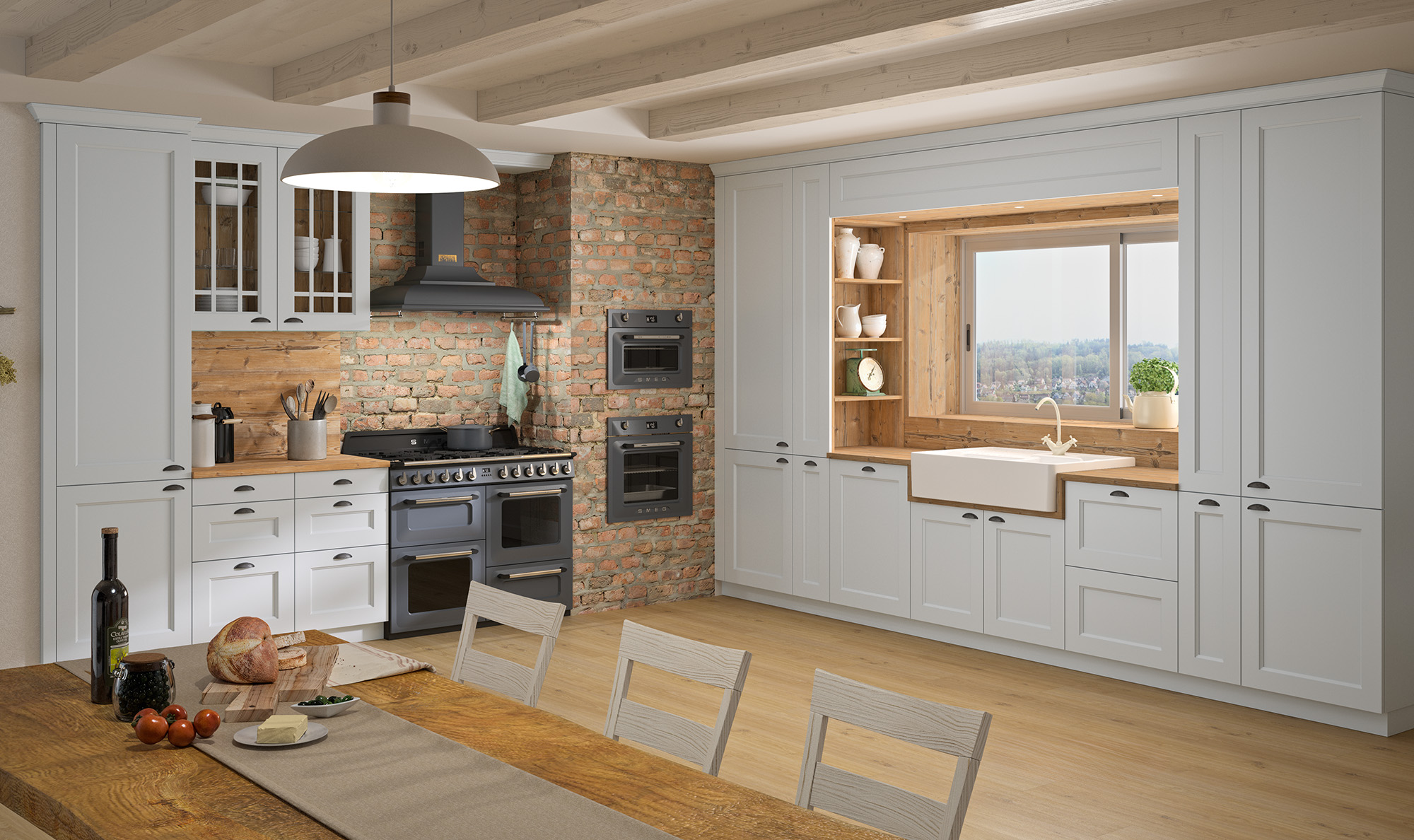 Die charmante Küche mit klassischen Rahmenfronten ist in einer Auswahl von sechs stilvollen Farbtönen erhältlich. Offene sowie geschickt versteckte Nischen bieten Platz für alltägliche Dinge und setzen diese raffiniert in Szene. Eine hochwertige, große Keramikspüle und der Blick in die Natur verbinden Arbeit und Vergnügen.