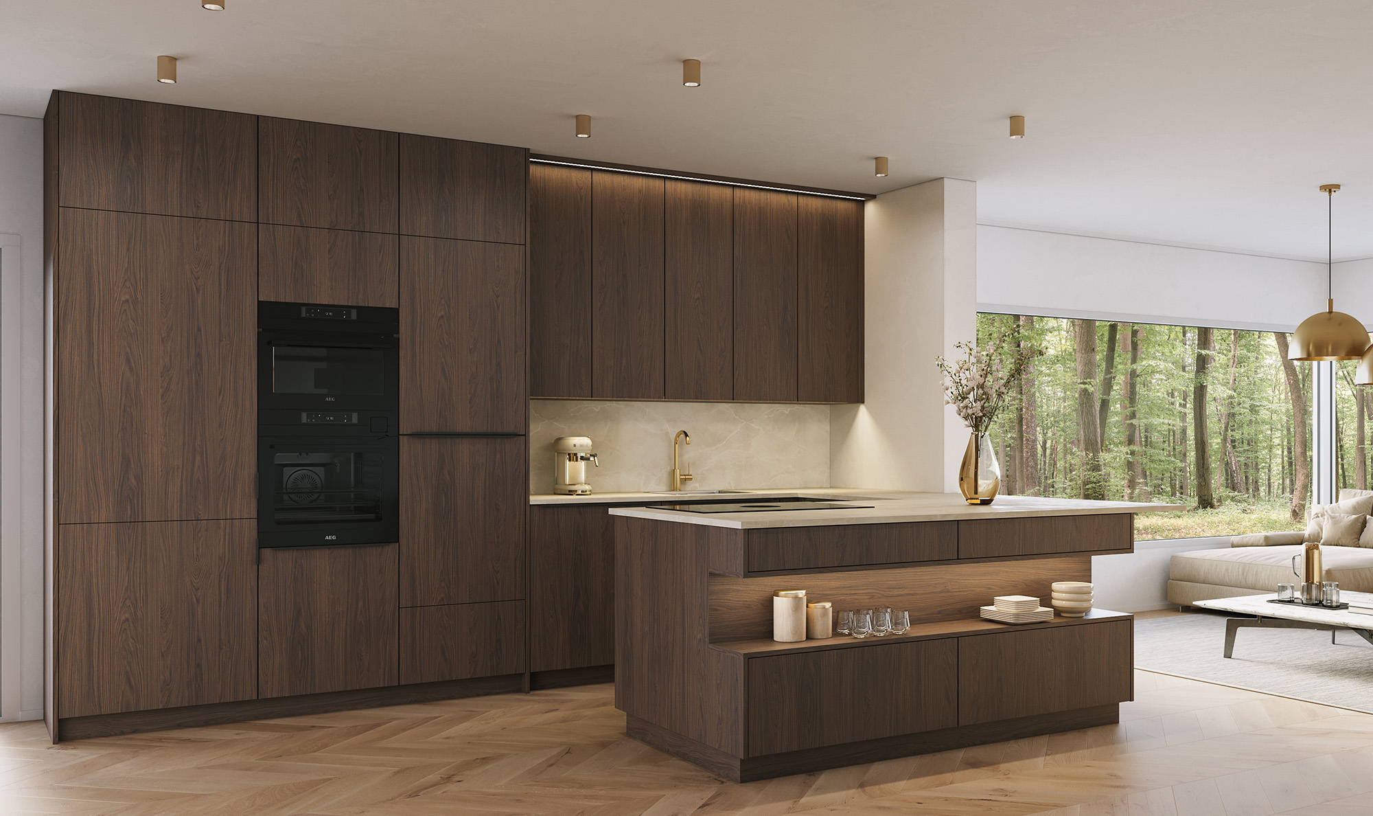 Die Maserung verläuft durchgängig über alle Fronten und sorgt so für ein harmonisches und ruhiges Gesamtbild. Dieses feine Detail zeigt die Sorgfalt in Planung und Verarbeitung – weil oft gerade die kleinen Dinge den Unterschied machen.