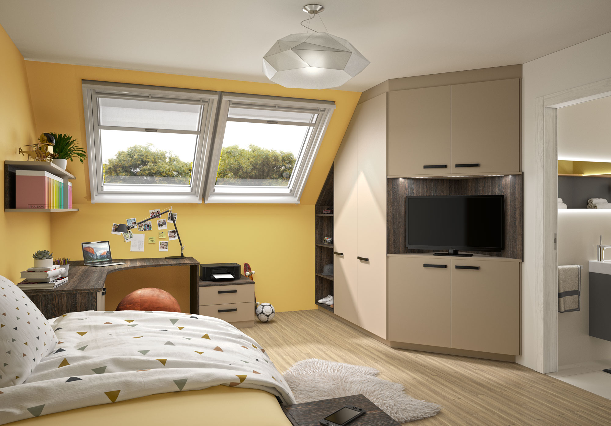 Dachschrägen optimal auszunützen ist vor allem bei kleinen Räumen von Bedeutung. In dieser Wohnschlafkombi konnte hinter dem durchdachten Schrankverbau ein Toilettenbereich abgetrennt werden, dessen Atmosphäre mit warmen Wandfarben sowie herrlich praktischem Waschtischverbau besticht. Somit wird keine Fläche verschwendet, ohne dass der Raum zu überladen wirkt. Der Eckschreibtisch mit einer schön designten Freiformplatte unter dem Fenster lädt zum produktiven Arbeiten ein.