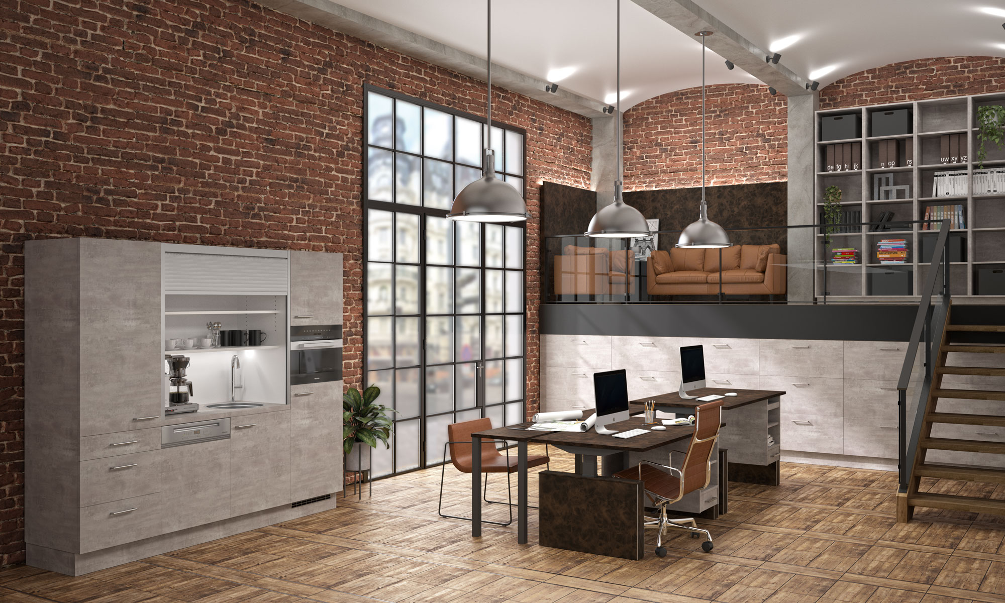 Smarte Büromöbel für jeden Einsatzbereich ermöglichen eine funktionale, freundliche Umgebung, um Kreativität freien Lauf zu lassen. Eingebettet in ein ehemaliges Industriegebäude harmonisiert die moderne Einrichtung dieses Kreativbüros durch die vielen Möglichkeiten, sich zu entfalten. Die Materialien wurden bewusst kontrastreich gewählt, von schlichten Betonoptik-Fronten bis zur Umgebungsgestaltung in Saloon – mit genialer Lederoptik im Möbelbau. Die kompakte Büroküche vereint Spüle, Geschirrspüler, Kühlschrank und Mikrowelle in einer übersichtlichen Einheit, welche sich auch auf kleinstem Raum umsetzen lässt.